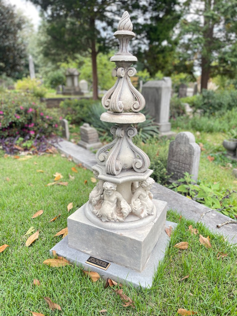 This isn’t a headstone but rather an accent piece in the plot of a former Atlanta politician. It came from the old Atlanta Terminal Station that opened in 1905 and was destroyed in 1972. Some of the most famous US trains came through the station in its heyday – Crescent, Man o’ War, Nancy Hanks, Ponce de Leon, and Silver Comet. Aren’t those names something? And now this sculpture is in another iconic landmark but I think this time it won’t be moved for a very long time.