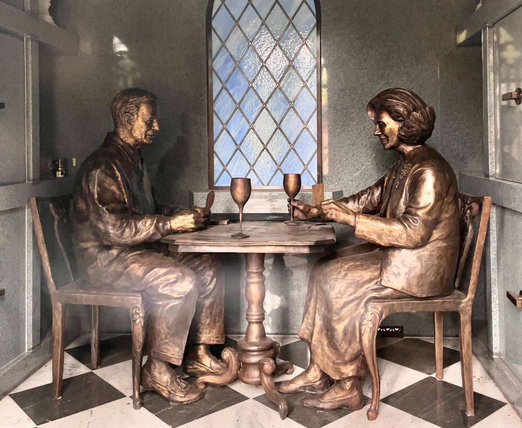 They still hold burials and internments at Oakland, and these bronze sculptures are one of the more recent contributions. It’s called The Never Ending Card Game and you have peek into the Harris mausoleum to see it. Donald died in 2017 and Susan in 2022 but they’re forever enjoying what they loved most at the very table, dipped in bronze to match the rest sculpture, from their home.
