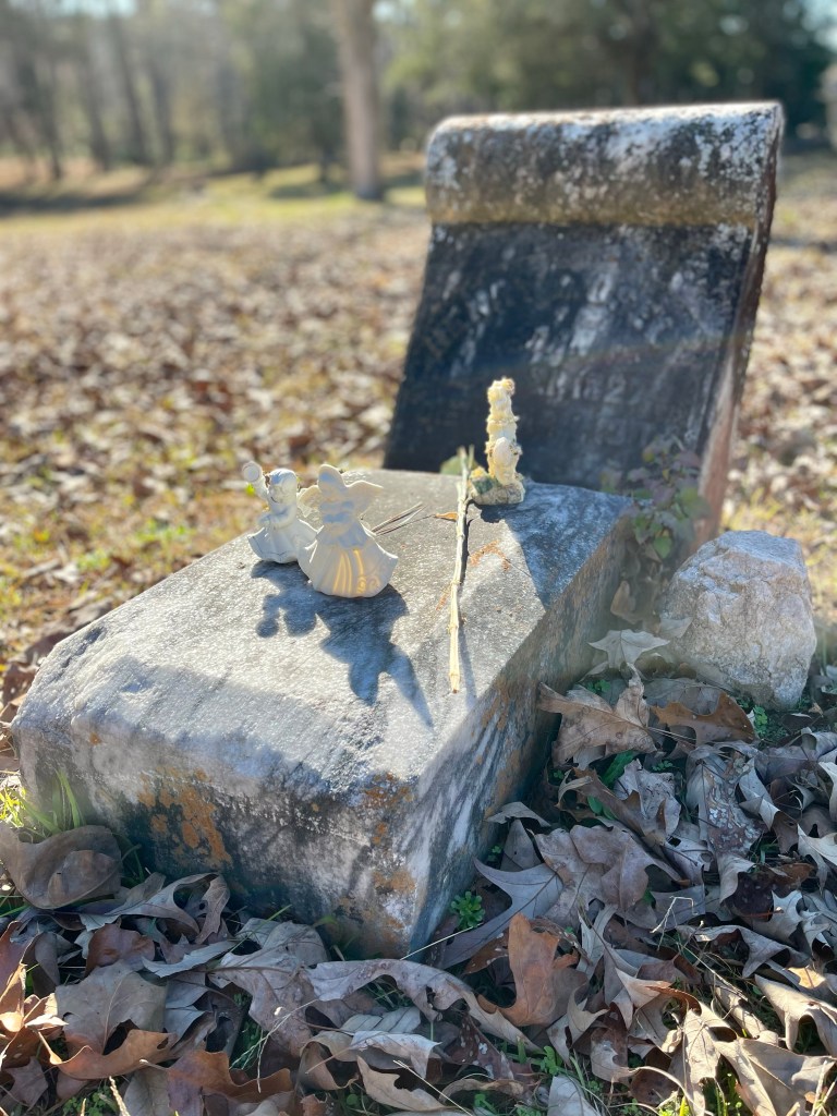 There are other graves in the cemetery marked with stone but they’re scattered about and in poor condition. But if you look around you’ll notice that angels are everywhere – a gold figure on the fence, in the form of small ceramic grave goods and a human sized bronze angel that was placed nearby during the restoration to act as a guardian for those buried here. And that’s an indicator that this cemetery, once very much forgotten and neglected like the buildings nearby, is now safe(r) under the watchful eye of the historic community…