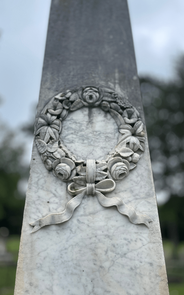 The wreath, when carved on gravestones or monoliths, has a lot of meanings. Eternity. Circle of life and death. Rebirth. And to gift one to the deceased is a symbol of peace and respect.