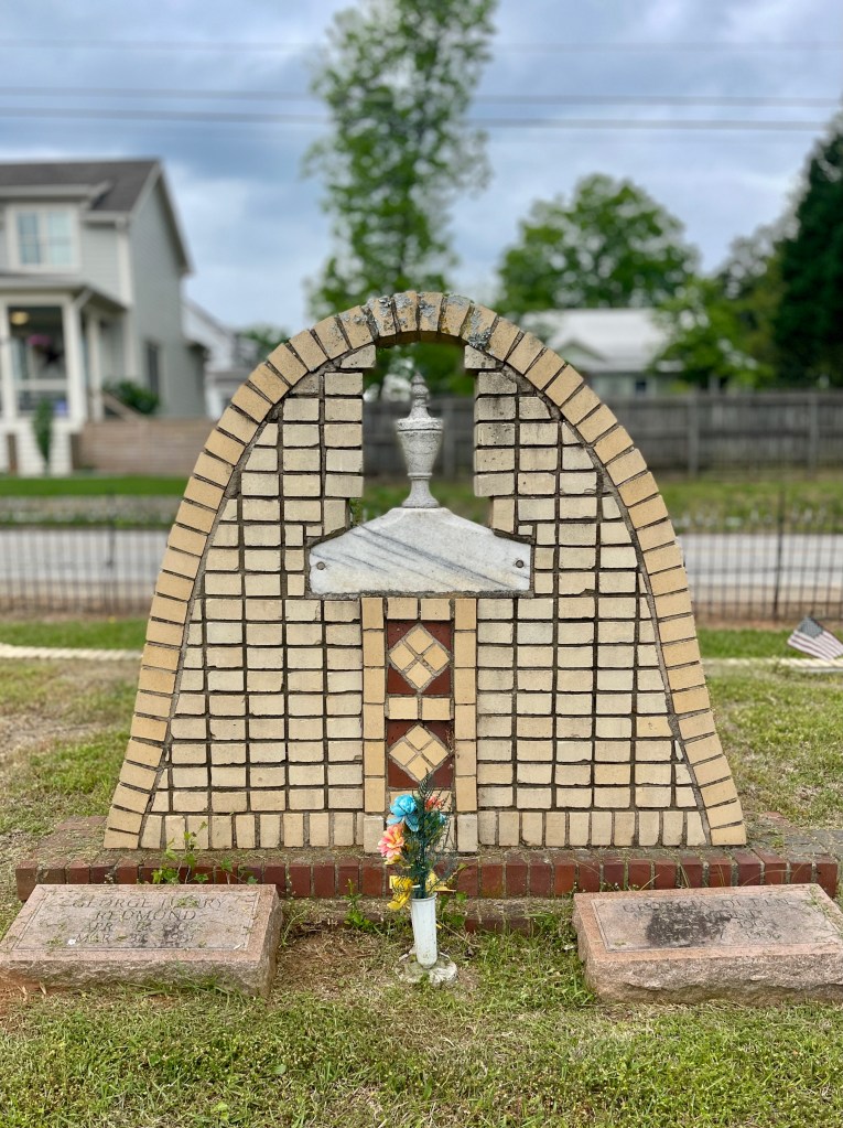 A handcrafted gravestone using a distinctive yellow brick motif.