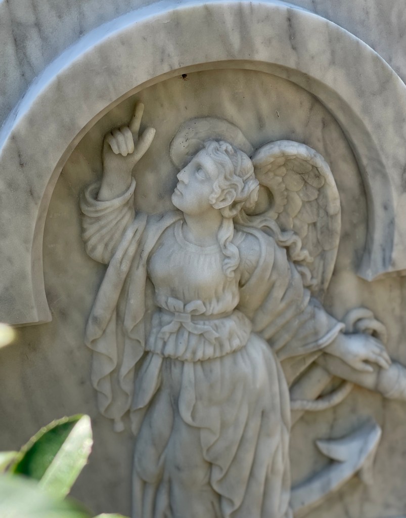 Lean into the light. Rich with cemetery symbolism! The arm in the sling is rather unusual but from what I can gather it’s a nod to a familial mourning style specific to this person’s profession.