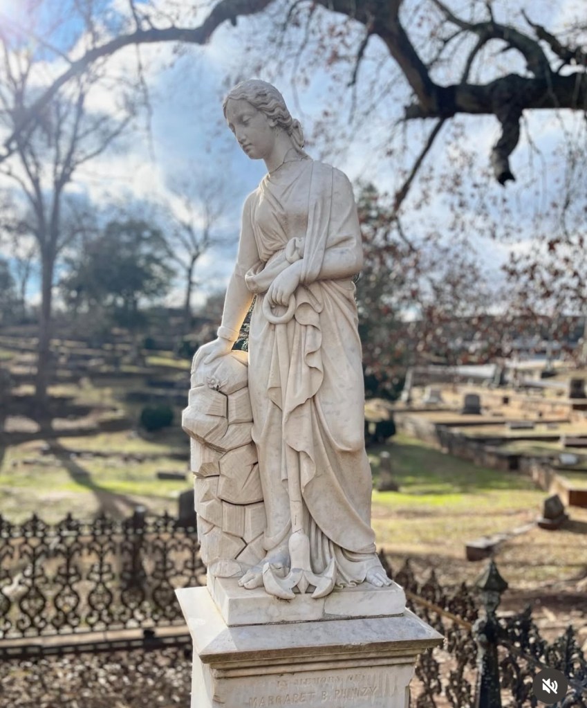 One of the most photographed monuments in Oakland Cemetery and rightly so! It was completed in 1874 for mother and daughter, Mollie and Mary Lizzie Neal, and it is so beautifully ornate. It’s a neoclassical design and it is full of Victorian symbolism. And the figures are ‘life sized’ so you can imagine how much space it trulys holds amongst the greenery.