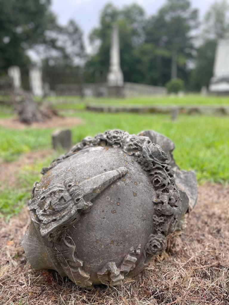 A piece of a monument has fallen victim to either time, the elements or vandalism. Sadly, many cemeteries have seen damage from all three. Especially sections that housed paupers or minority communities since those plots were usually placed in the least desirable areas of the cemetery such as floodplains.