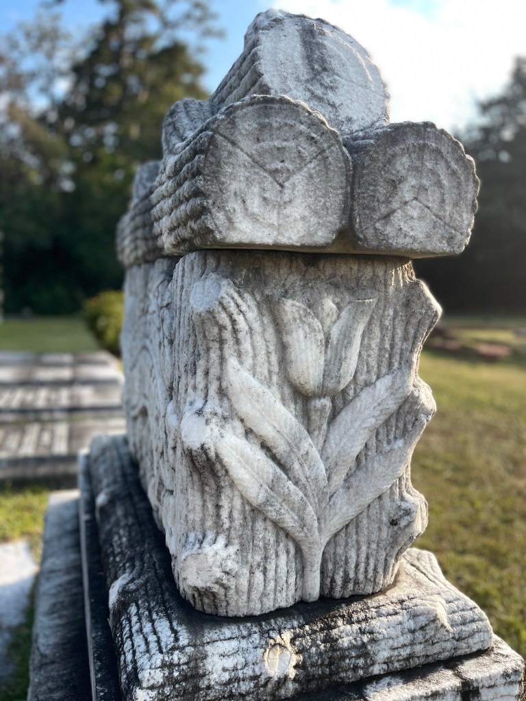 A tree stump tombstone with these Dutch styled tulips on the side. I have a tulip tattoo that looks wildly similar so I was very happy to find this one!