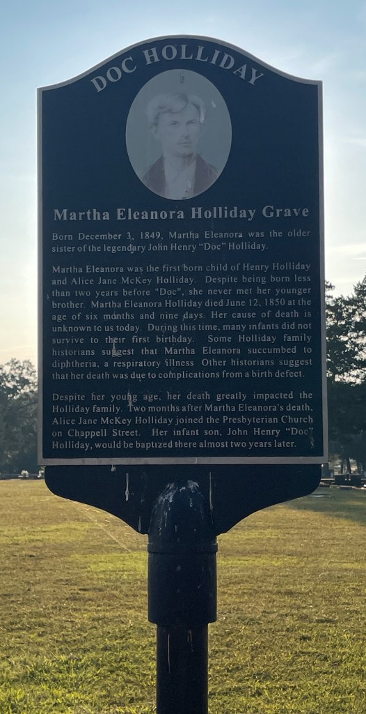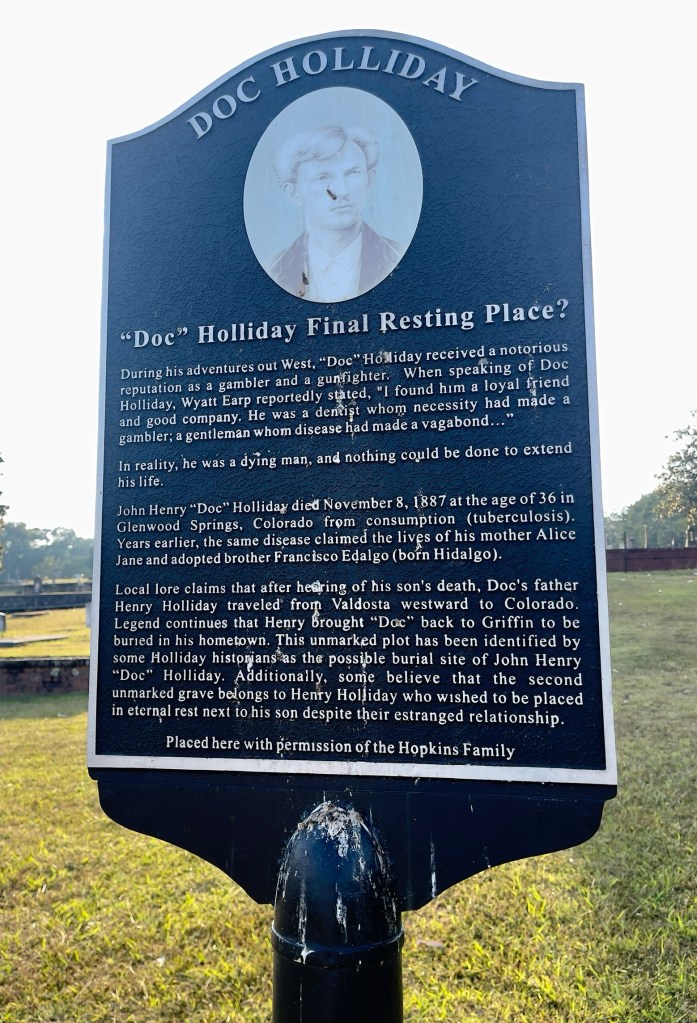 And now for the famous folks! Supposedly Mr. “I’m your huckleberry” himself ‘Doc’ Holliday is buried here although it’s a hotly contested topic since Glenwood Springs, Colorado has long had a grave bearing his name. Same goes for his father Henry who, as the sign claims, decided to be buried next to his son and not where his current grave marker sits next to first wife Alice in Valdosta, Ga. Supposedly Henry moved Doc’s remains from Colorado to Griffin so he’d be closer to the family land…