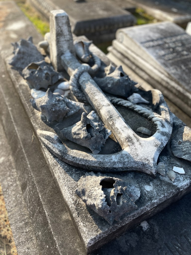 The grave of ‘Little Sister’ August Madeleine Mc Williams. She has quite the collection of sweet grave goods – kitties, bird baths, toys, live plants. Her monument is prominently used in advertising for the cemetery…