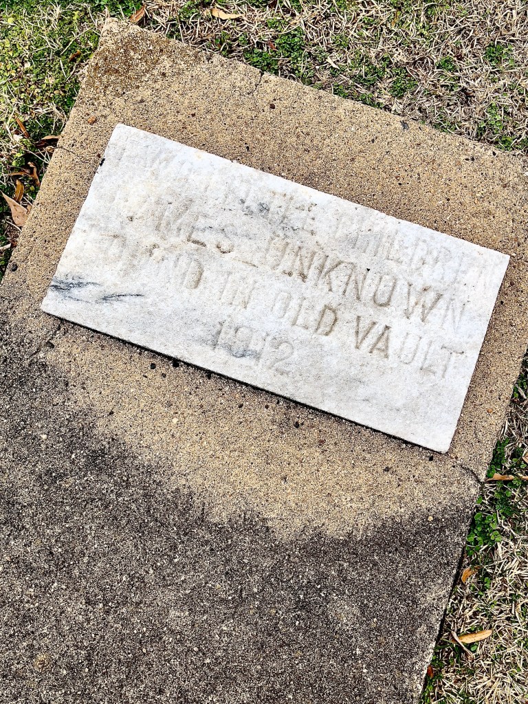 Faded epitaph reads “Two little children. Names unknown. Found in old vault. 1912.“