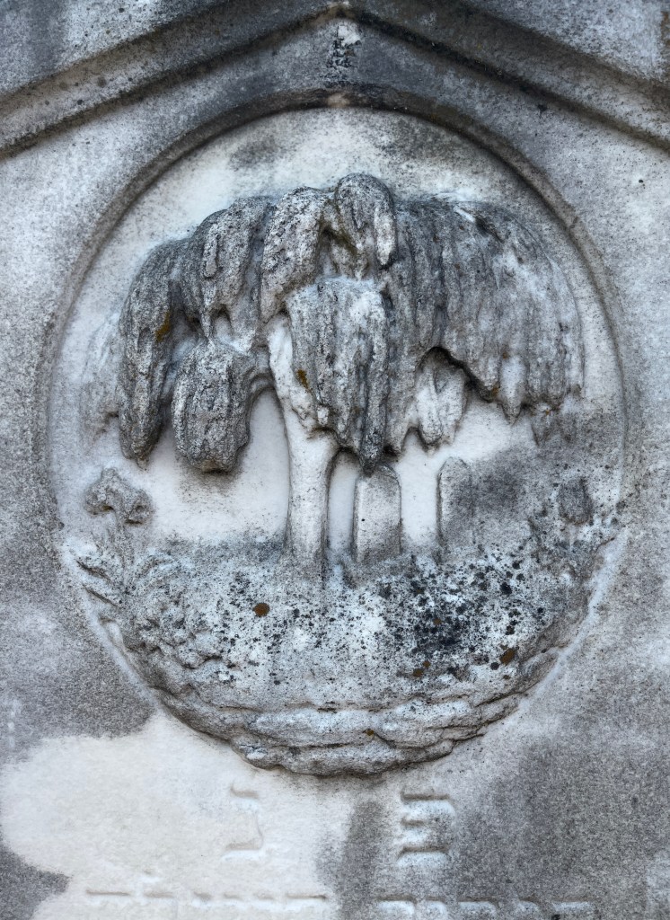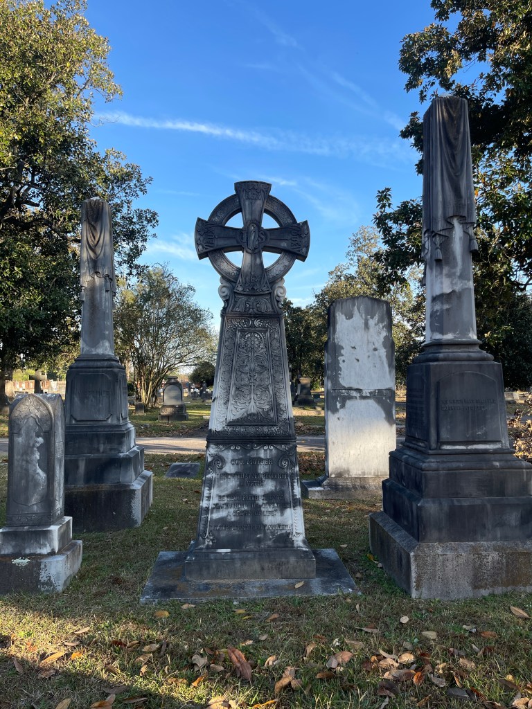 The amount of damage done to the cemetery by Hurricane Helene is both shocking and heartbreaking. Dead limbs and trees are piled up by the brick fencing, and the landscape is scarred with the stumps of once lovely oaks and magnolias. And I lost count of how many graves and obelisks and cast iron fences were toppled or crushed. The above photo is what remains from a site bearing a classic colonnade that had survived over 100 years only to fall last year to wind and limbs. You can see the original here.